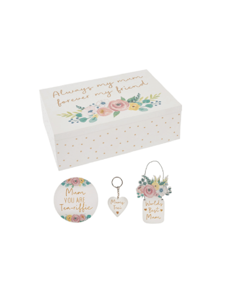 Large Wooden box measuring 25*16*9cm with a wooden coaster, keychain and hanging ornament inside.