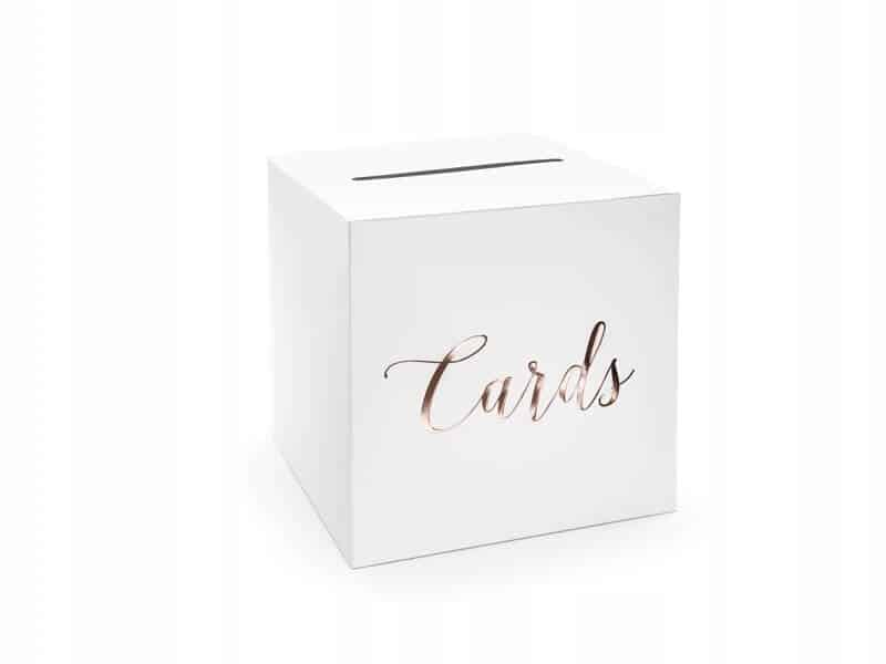 Keep your special occasion organized and elegant with this stylish card box. Designed in a clean white finish, it features a metallic rose-gold “Cards” script on the front and a slot on top for easy collection. Perfect for weddings, engagements, anniversaries, or any celebration where guests bring greeting cards or gift envelopes.