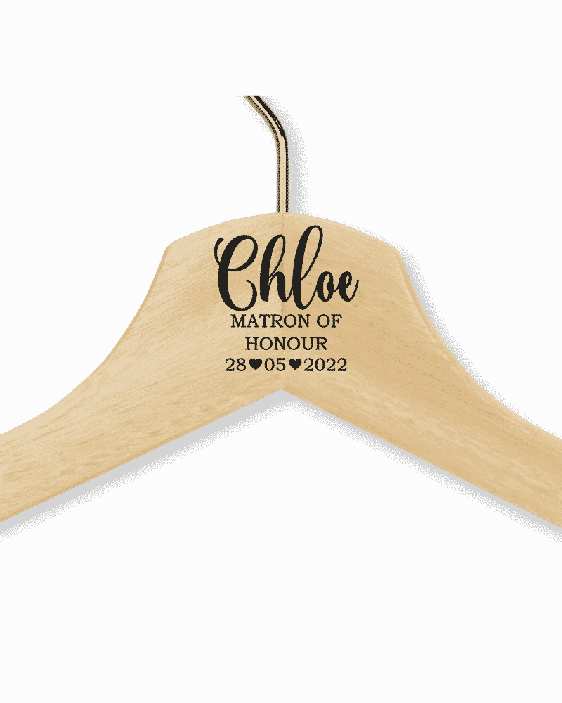 Your wedding day is one of the most important days of your life. Celebrate it with a Personalised Wedding Hanger. Our hangers are custom made to your liking. For those who love a personal touch, this personalised wedding hanger is a perfect way to commemorate the big day. The hanger can be personalised with a name, date, and role. There are different options for the colour of the wood, and various different fonts and colours.