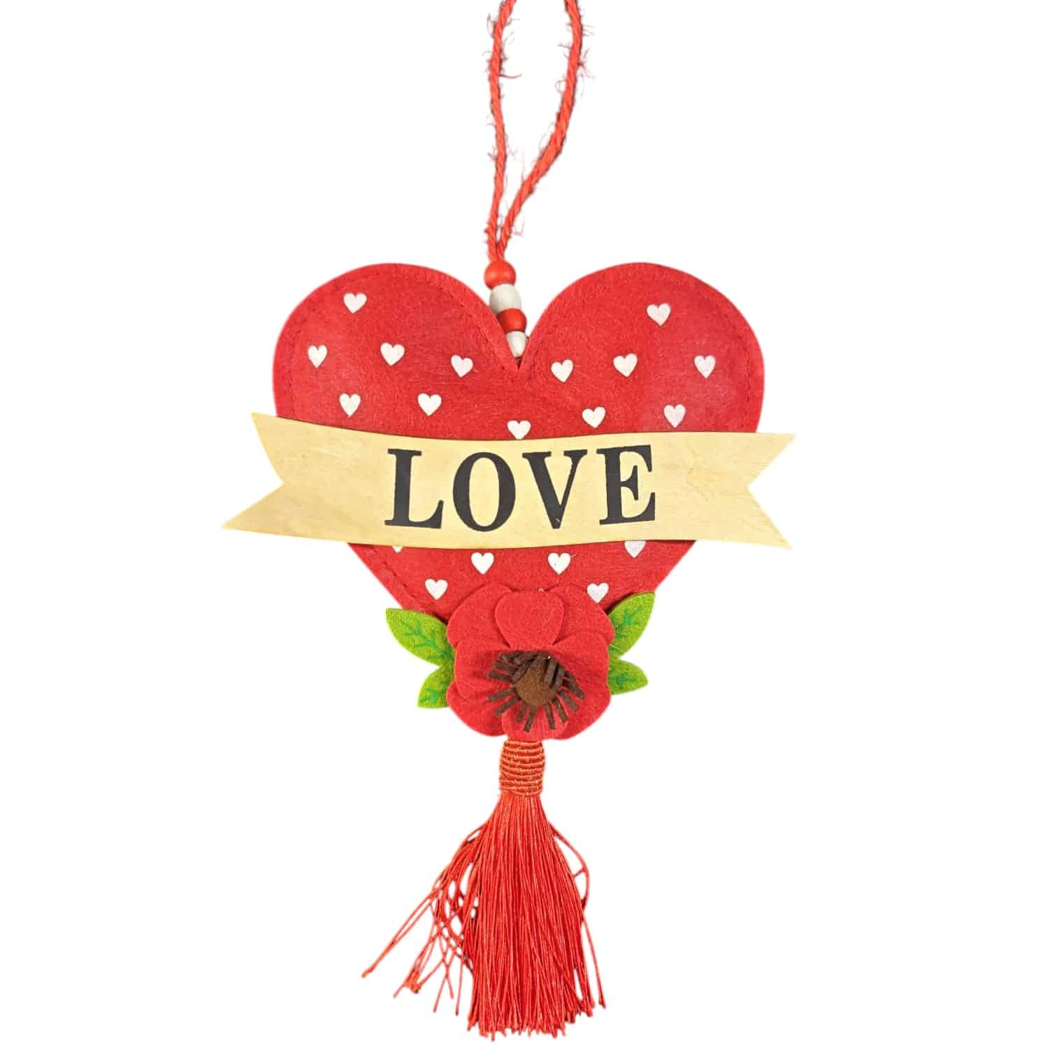 Add a touch of romance and charm with this beautiful heart-shaped hanging decoration. Made from soft red felt and detailed with a wooden “love” script and arrow, it’s adorned with decorative felt flowers and finished with a vibrant red tassel. Perfect for Valentine’s Day, weddings, or simply to brighten any space with a loving message. Each ornament is finished with a bold red tassel