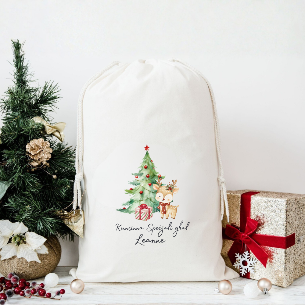 Each sack is beautifully illustrated with festive designs and personalised with your chosen name — perfect for holding gifts from Santa or for decorating under the tree.